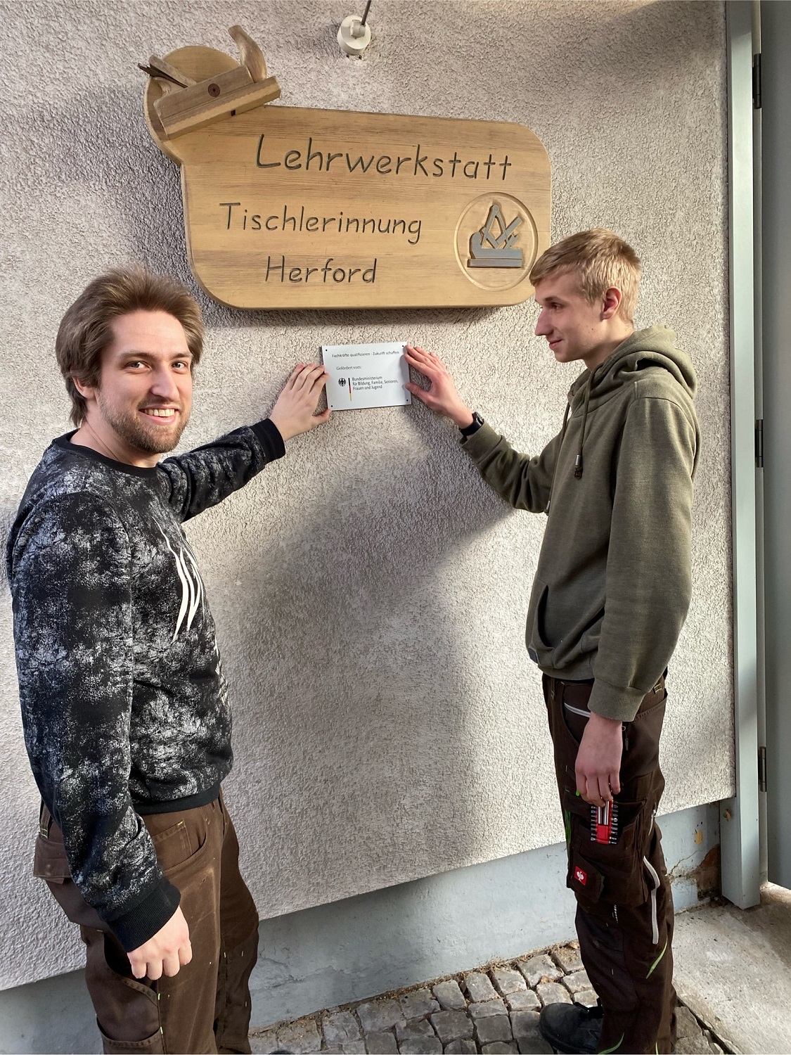 Ausbildungsmeister Heiko Bahls präsentierte mit den Lehrlingen das Förderlogo, das am Haupteingang und vor dem Maschinenraum angebracht wurde.